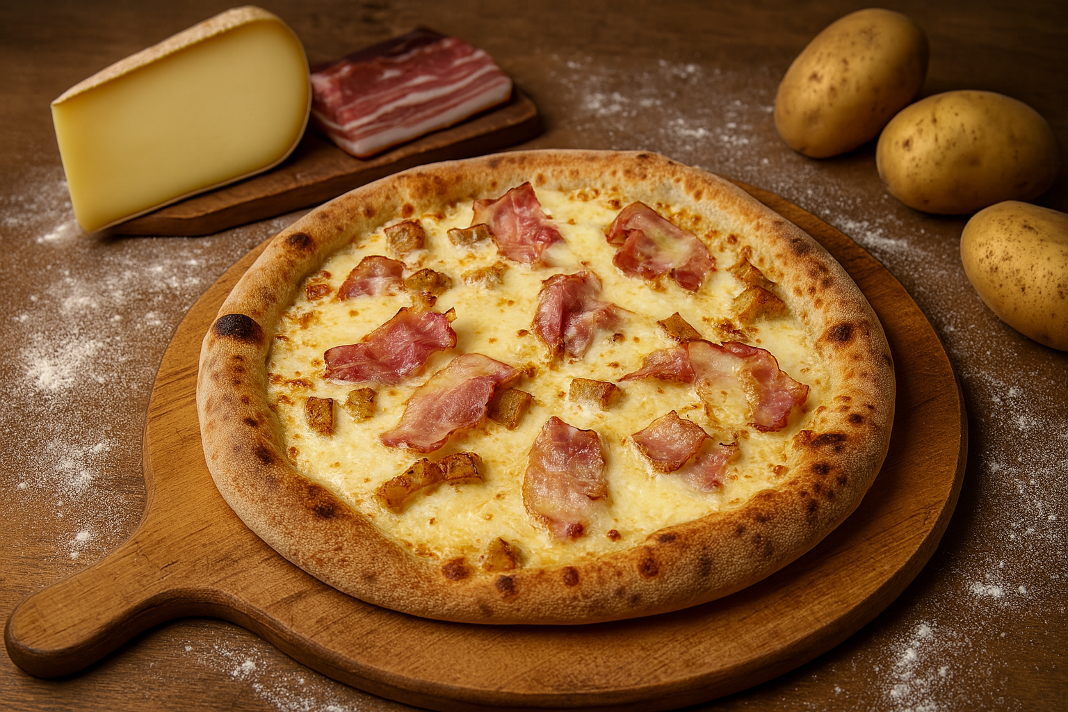 Il y a des soirs où une part ne suffit pas… alors on sort la pizza gourmande : crème onctueuse, mozzarella fondante, pommes de terre rôties, raclette bien coulante, oignons rouges… et la touche finale ? Ta viande préférée au choix – jambon supérieur, poulet mariné, chorizo ou poitrine fumée. Un seul mot : Gourmande
