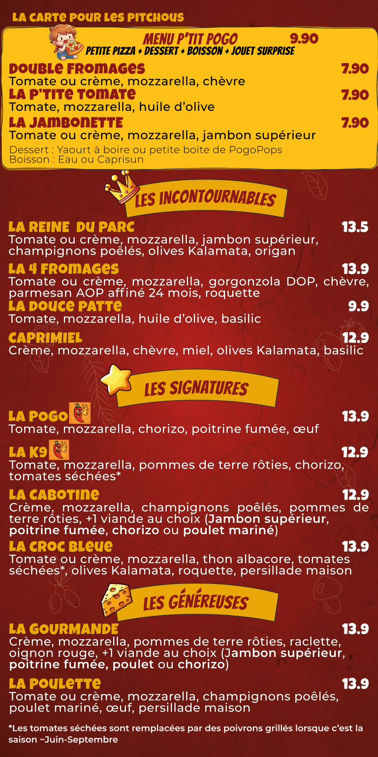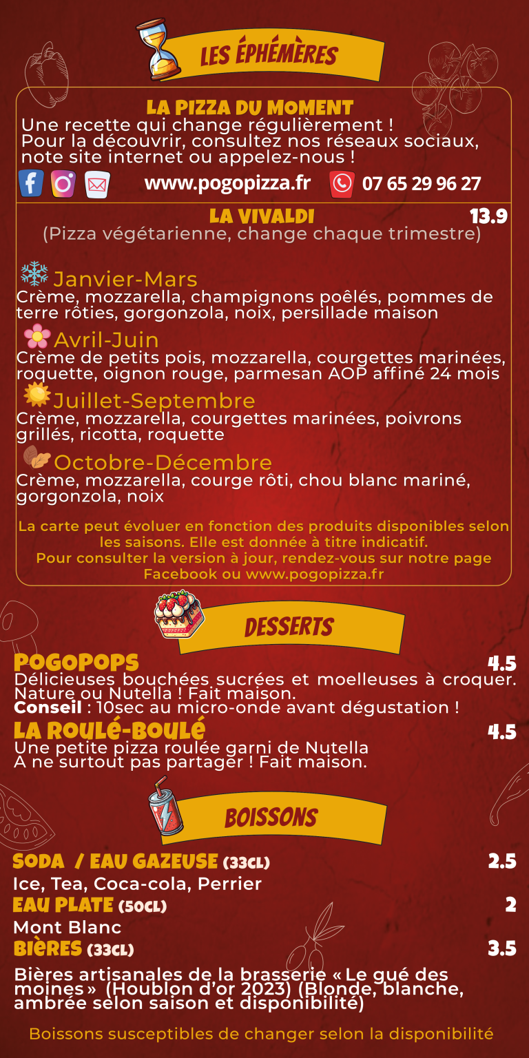 La carte Pogo Pizza La pizza du moment ! 🍅Base Tomate Mozzarella🥓Jambon de bayonne🧀Parmesan AOP🫒Huile d’olive🌿Roquette⚫ Poivre du moulin Quantités & durée limitées ! Nous contacter 📞 07 65 29 96 27